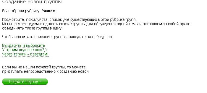 Если ни одна из рубрик Вам не подходит, выбирайте рубрику "Разное". И нажимайте. Вы увидите список групп, уже существующих в разделе, внимательно посмотрите, не похожа ли одна из них на ту, какую Вы задумали. Клонирование и варьирование групп не приветствуется.