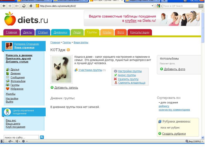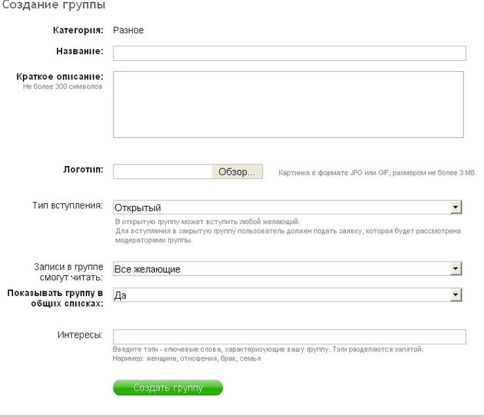 Заполните пустые поля: название группы, ее артинка (по которой Вашу группу можно будет узнать среди других), краткое описание и настройки. Заполнив, нажмите "Сохранить". Ваша группа займет свое место среди других в выбранной рубрике.