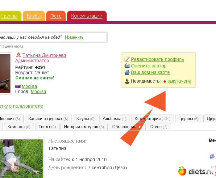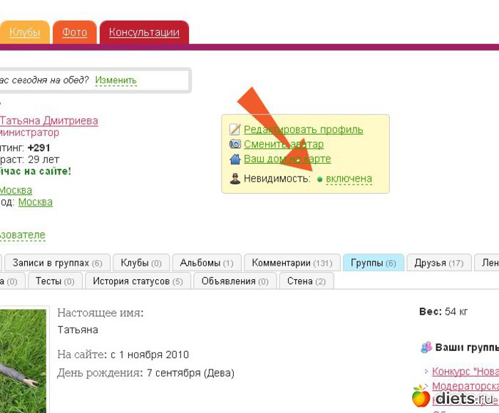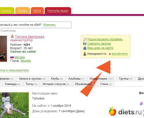 Для того, чтобы стать невидимкой (ваш ник не будет отображаться в блоке «Сейчас на сайте:», а в записях пользователей ваше посещение останется незафиксированным) достаточно зайти в свой профиль.