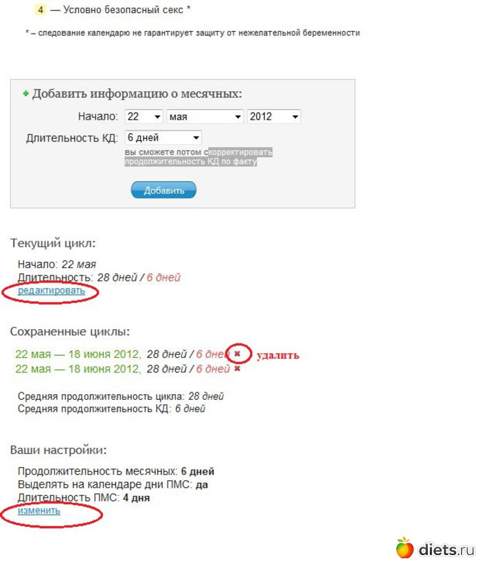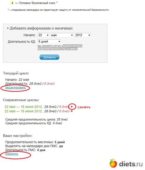 5. Редактировать текущий цикл, удалить какой либо из сохранных циклов и изменить настройки, можно прокрутив страничку вниз и выбрав нужный пункт для редактирования или удаления