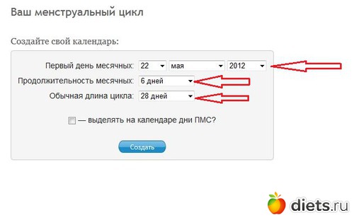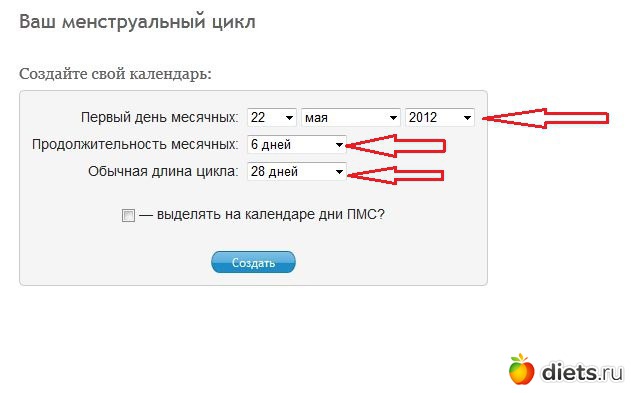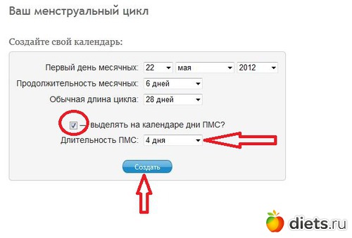 3. При наличии ПМС (предменструальный синдром) поставить галочку в окошке напротив строки "выделять на календаре дни ПМС?". В окошке, напротив соответствующей строки выбрать длительность ПМС. Нажать на кнопку "Создать"