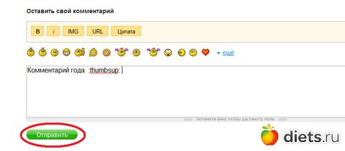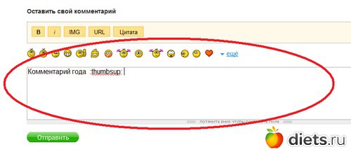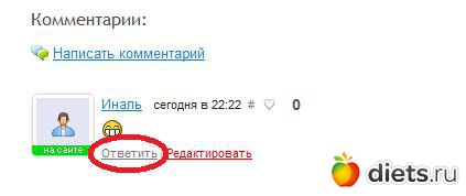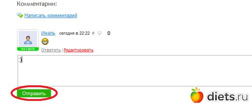Чтобы оставить комментарий к понравившемуся материалу (статье, записи в дневнике или фотографии в альбоме) - то есть, комментарий первого уровня, необходимо опуститься в нижнюю часть страницы с материалом к окошечку «Оставить свой комментарий». (Для добавления комментариев необходимо быть зарегистрированным и залогиненным пользователем сайта diets.ru),