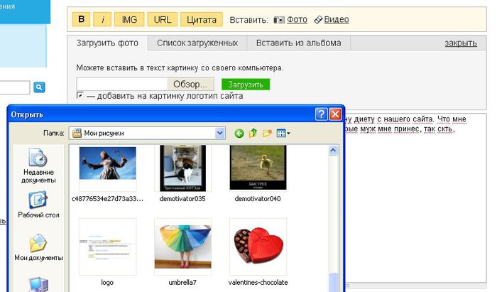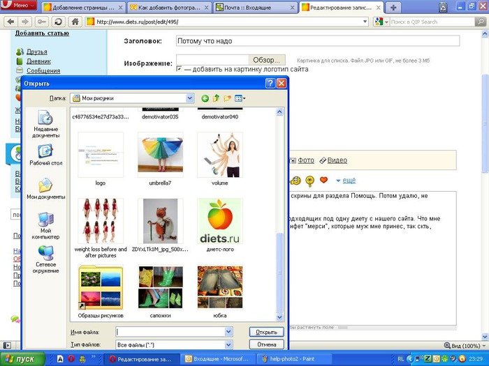 Появится окошко и кнопка "Обзор". Нажмите ее и выберите фото с Вашего компьютера, приготовленные в качестве иллюстрации к записи.