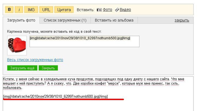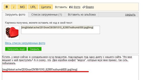 Сохранив картинку кнопкой, Вы получите код-ссылку, который надо просто скопировать и вставить в текст записи в нужном месте. После нажатия кнопки "Сохранить" этот код станет картинкой.