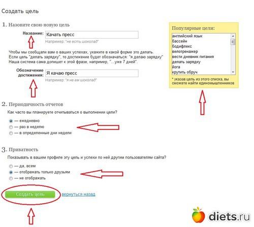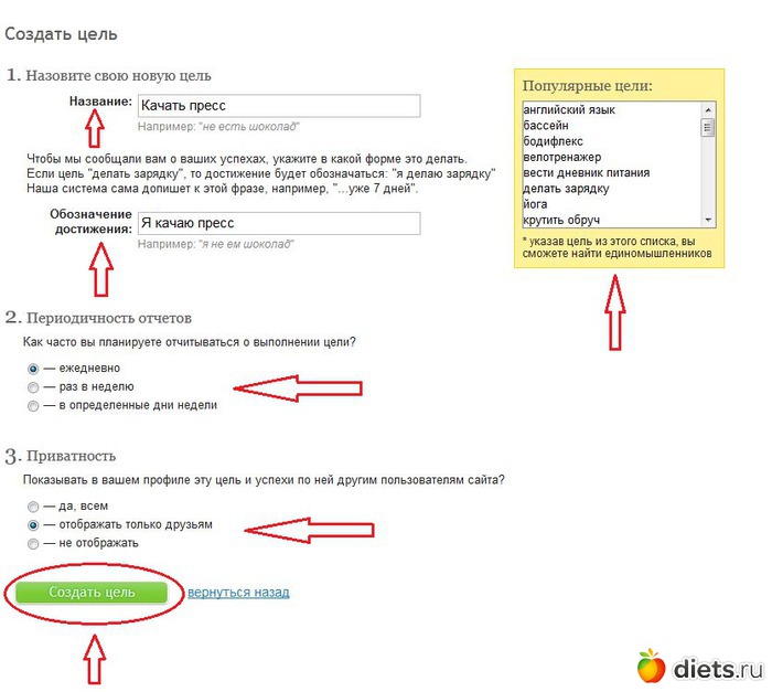 3. Заполнить предложенные три пункта согласно своим предпочтениям и предоставленным вариантам. Нажать на зелёную кнопку "Создать цель".