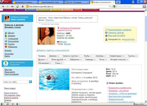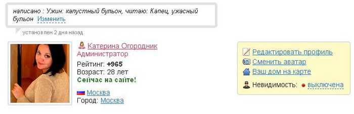 Там же, в окошке, находится кликабельная ссылка "Изменить". Нужно нажать на неё, написать новый статус и сохранить. Ваш новый статус мгновенно станет виден всем, кто заходит в ваш профиль, а также, наводит курсор на ваш ник на сайте.