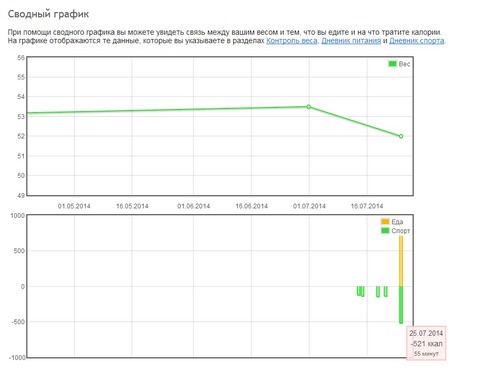 При помощи сводного графика, вы можете увидеть связь между вашим весом и тем, что вы едите и на что тратите калории. На графике отображаются те данные, которые вы указываете в графике веса, дневнике питания и дневнике спорта. Опция "
