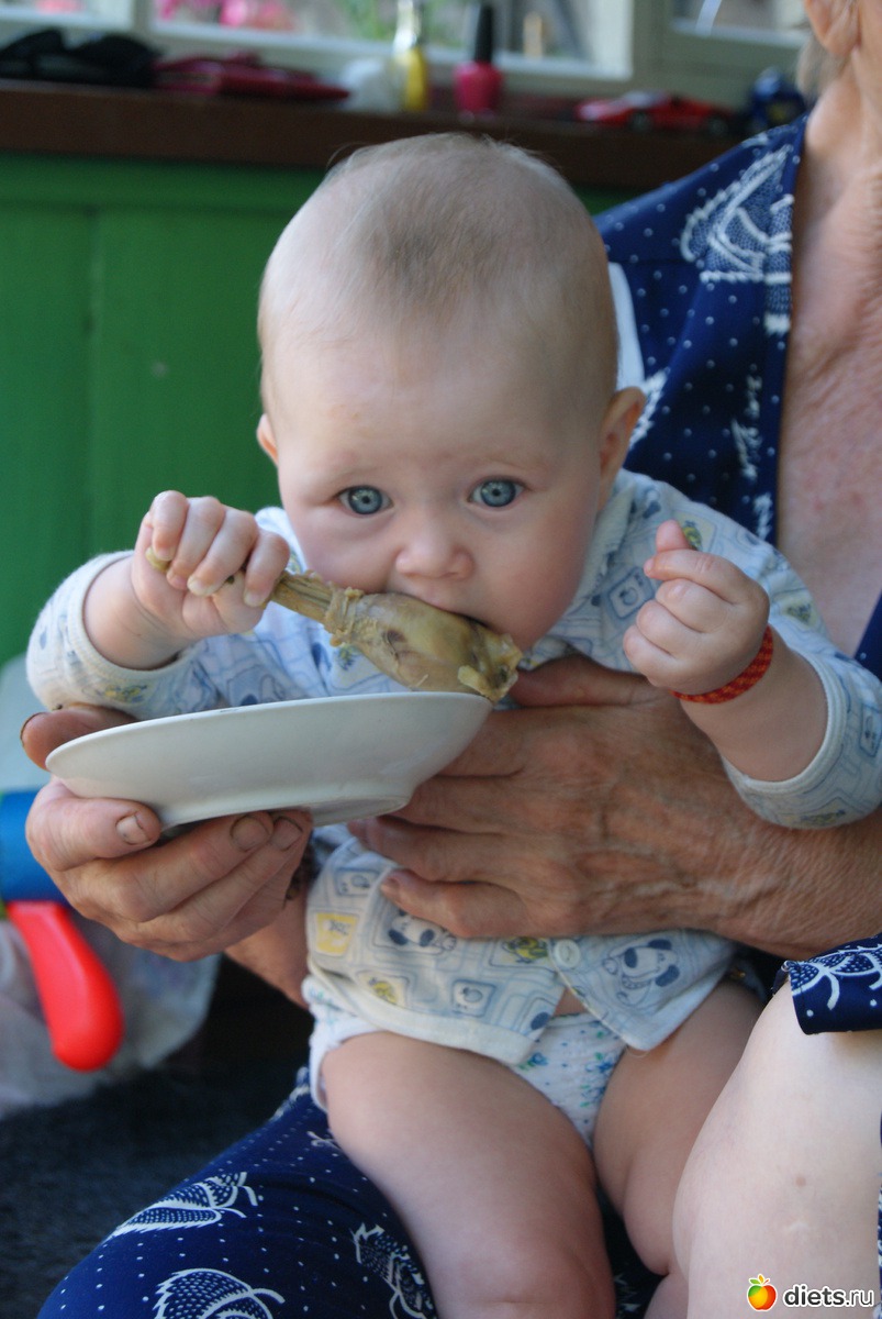 "Мяса растущему организму!!!" Не съем, так покусаю))) Дочь Варя и ее прабабушка, вырастившая и сварившая эту куриную ножку (конечно вместе с остальной курицей:))
