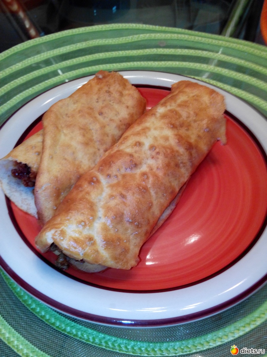 Вообщем оторвала верхнюю часть и завернула в неё говяжий фарш с луком и томатной пастой. Получилось вкусно, но вот почему не получилась пита. Неужели все дело в сухом молоке?