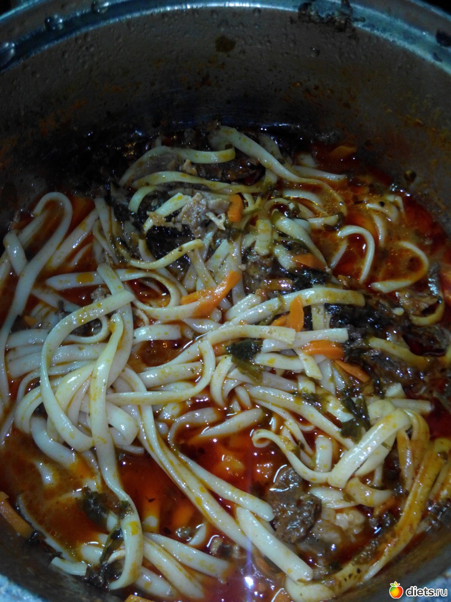 чек кинзы и петрушки ( я делала только с петрушкой) - тушим. Так как у меня остались кости я сварила на них бульон и в него выложила потушенную баранину, а так же добавила морковки. Когда все проварилось солим и добавляем лапшу, варим до готовности. Оооочень вкусно, очень остро и жирно. Вообщем для любителей остренького.