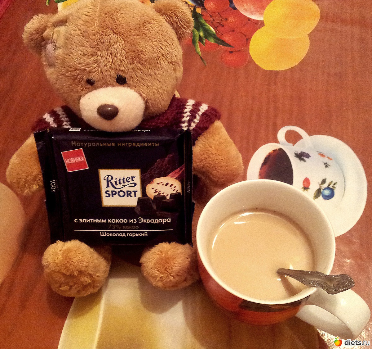 «Доброго и хорошенького утра всем!!! Ну разве не красота,начать утро с кусочка горького шоколада и чашечки цикория с молоком!МММММ....Вкусняшка!!!! Но только не увлекайтесь! Отличное,позитивное,солнечное настроение обеспеченно на весь день)))»
