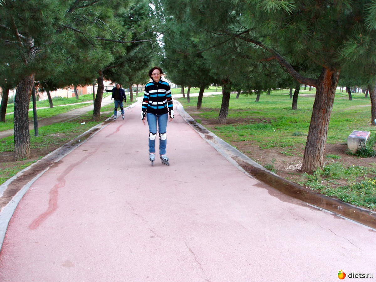 На заднем плане друг нашей семьи. Он вчера первый раз на ролики встал. Пока вот так от дерева к дереву. Но полон решимости, сказал, что тоже купит коньки.