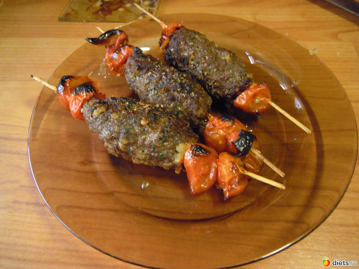 Слепить колбаски и надеть на шпажки. Шпажки замочить заранее в горячей воде.