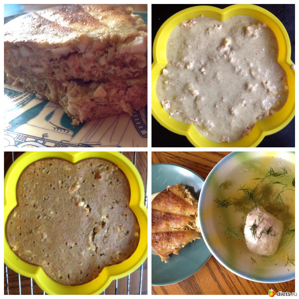 Начинка и тесто готовы, пора » собирать» наш пирог. В силиконовую форму (у меня 25 см диаметр и 6 см высотой) выливаем половину теста. На него равномерно выкладываем лук, сверху рыбу с яйцом. Далее заливаем второй половиной теста