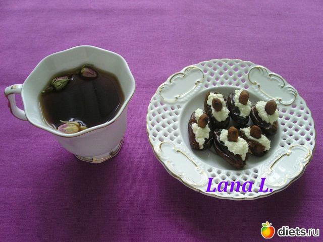 Из фиников вынуть косточки. Творог смешать с мёдом, нафаршировать этой массой финики, вложить в разрез по миндалю.