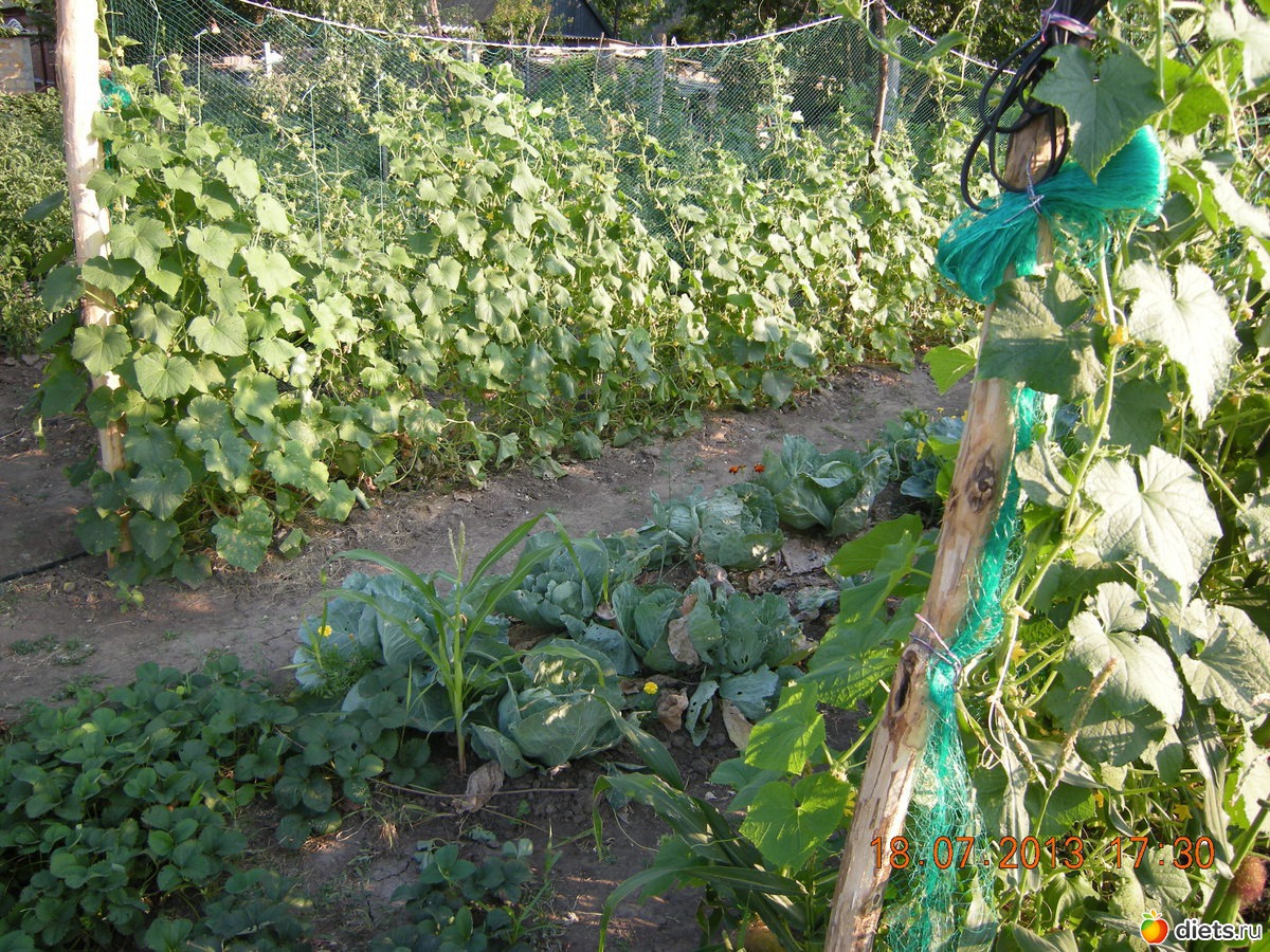 Грядки огурцов и капусты