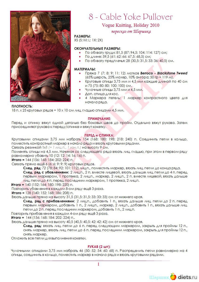 Пуловер с арановой кокеткой (CABLE YOKE PULLOVER) из ВОГ., альбом: вяжем-повяжем
