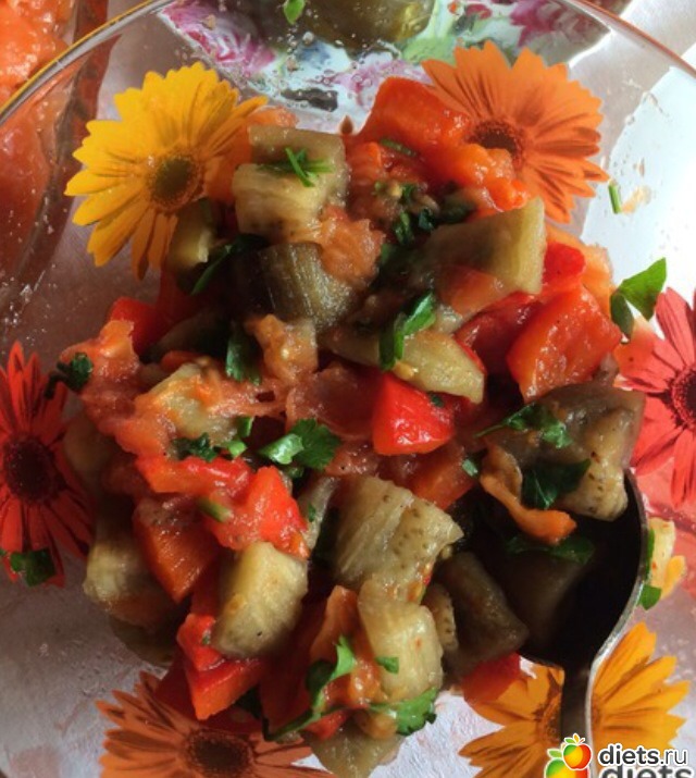 Баклажаны, помидоры, перец болгарский, чеснок запекаем на костре или в духовке. Очищаем от кожуры и режем, добавляем кинзы( можно любую зелень по вкусу). Теплый салат готов, приятного аппетита!!!