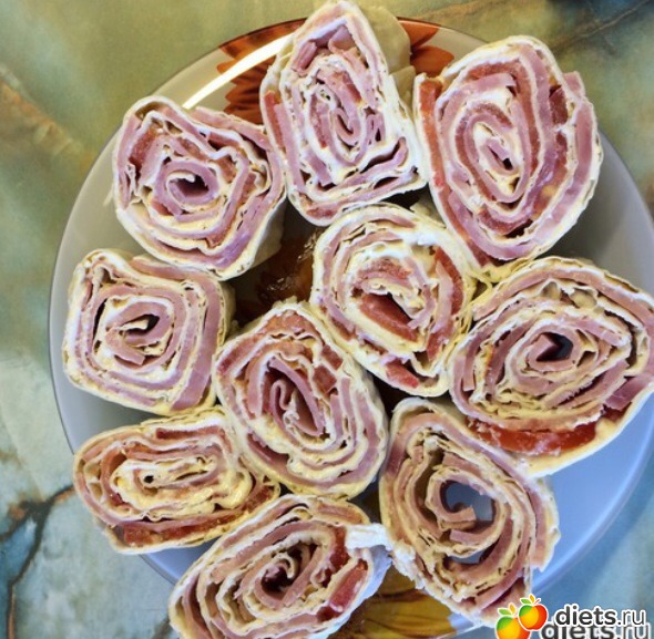 Испекла в духовке типа блина только квадратной формы и на пергаментной бумаге. Дала остыть намазала тонким слоем творога подсоленного. Выложила тонко порезанные томаты и ветчину и зелень. Свернула рулет, обтянула пищевой пленкой и положила в холодильник часа на 2.вынула порезала на порции.