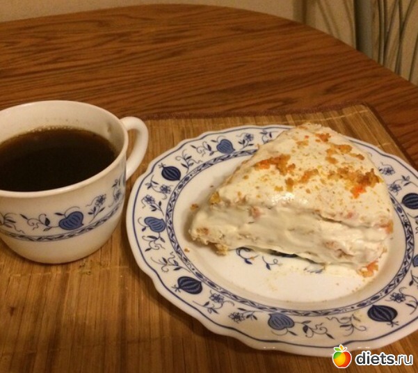 Замочить отруби в молоке с яйцом на 5 мин. В отдельной посуде смешать сыпучие продукты. Добавить к отрубям, перемешать, добавить морковь. Тесто вылить на сковороду, печь на медленном огне под крышкой. Полученный блинчик разрезать крест накрест или на 6 частей. Эти части собрать вместе, промазывая кремом.