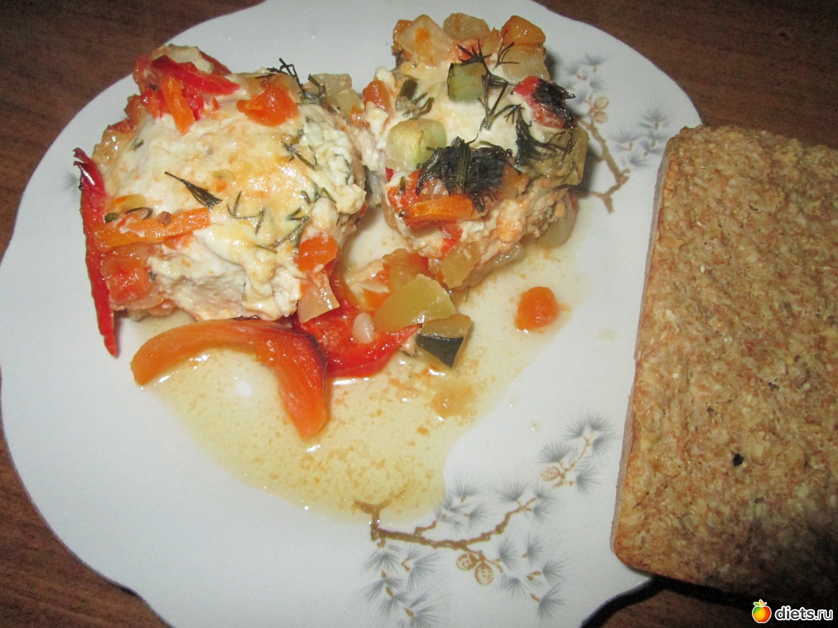 Делаем фарш, и мокрыми руками катаем колобки, у меня вышло 9 шт. На дно силиконовой формы я выложила половинку упаковки замороженной смеси лечо (в составе: перец сладкий, помидоры, лук, морковь, цукини), сверху уложила тефтельки, и еще один слой овощной смеси. Полила 3 ст.л кефира, смешанным с солью и посыпала зеленью.
