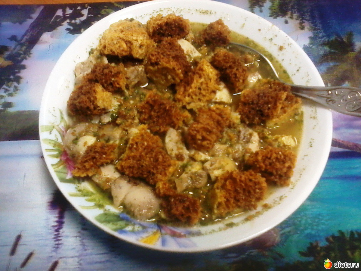 Сварить бульон (мяско любое). Посолить, добавить любимые специи. Мясо порезать мелко. Добавить зелень(1ст.л) пусть покипит минут 5-10. Перед подачей на стол добавим порционно сухарики Дю. Приятного аппетита!