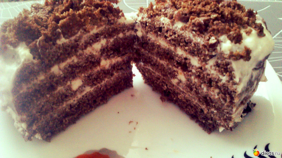 Получившийся корж разрезаем на три и пропитываем кремом каждый слой.