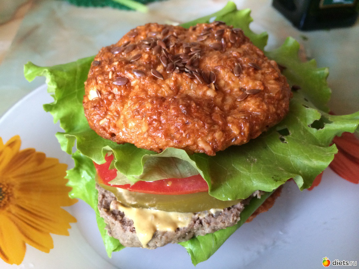 4 ст л овсянных отрубей, 1 ст л пшеничных отрубей, 3 ст л творога, яйцо,1 ч л разрыхлителя, 1 ч л крахмала, соль. Перемешать сформировать булочки посыпать семенем льна. Выпекать 20 мин при 180 градусах. Начинка по вкусу. У меня салат листовой, котлета говяжья, помидор, соленый огурчик, дю- майонез. Приятного аппетита!!!