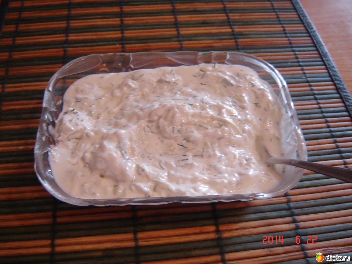 огурец - 2шт ,чеснок - 3 зубчика, йогурт натуральный - 250г ,оливковое масло - я каплю-две но можно не добавлять ,соль - по вкусу,укроп мелко режу.Натираешь на терке огурчик и отжать сок. ,все ингредиенты добавить,хорошенько перемешать...все готово!!Вкусно с курицей,морскими гадами,рыбой...