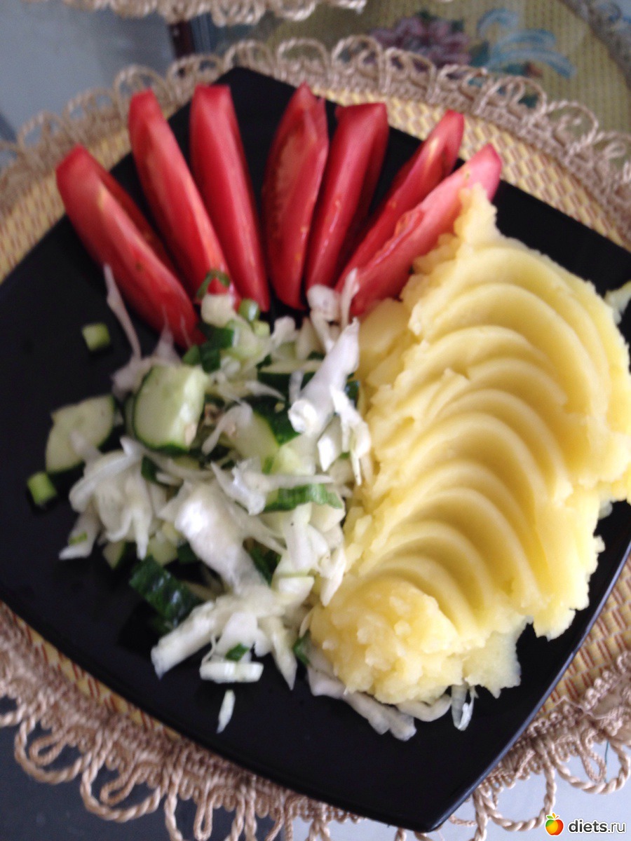 Пюреха на воде с салатом из капусты с огурцом и зеленым луком, и половинка помидора