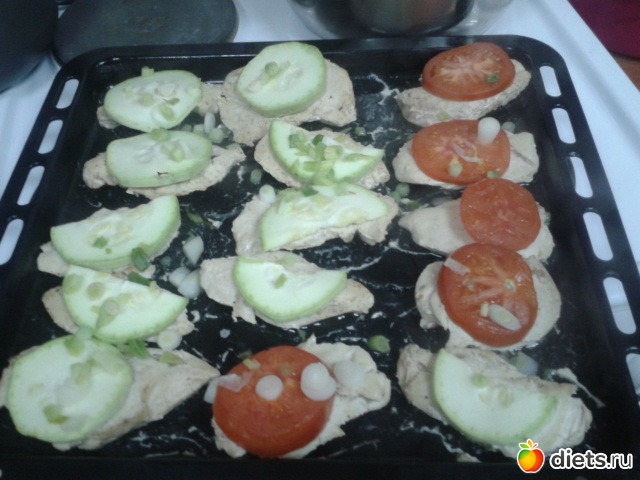 Куриная грудка с помидоркой или кабачком в духовке)) Готовила на 15 человек.Всех кормила системно))