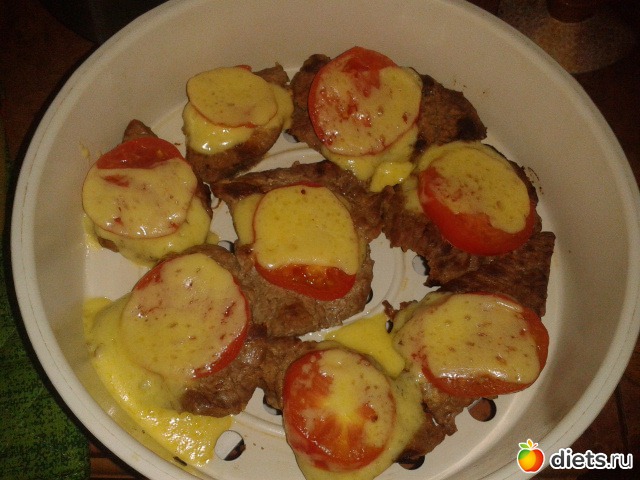 Филе говядины нарезала на небольшие кусочки,замариновала соком лимона,позже отбила мясо,уложила на решетку от мульти.Готовила в чаше тушеные овощи,но пара хватило чтом и приготовилось мяско),За 5 мин до готовности уложила колечко помидорки и кусочек сыра.Хватила 40 мин на блюдо 2в 1))