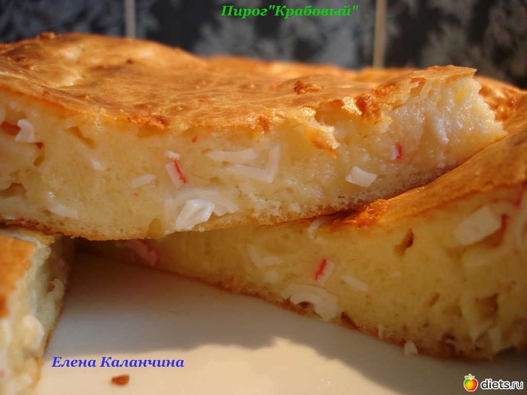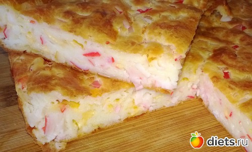 Тесто замешиваем. Крабовые палочки режем мелкими кубиками, сыр трём на крупной тёрке, соединяем с тестом и выпекаем при 180 гр. в течении 40-50 мин.Приятного аппетита!!!
