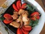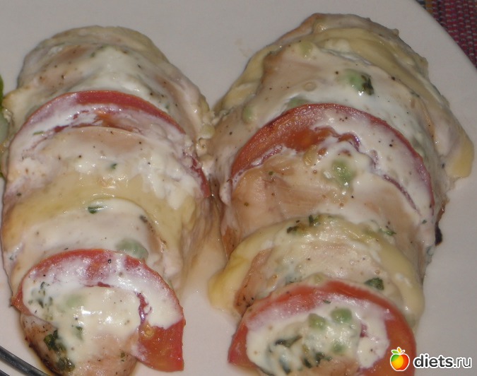 На каждом куске филе сделать три надреза поперек, не до конца, как кармашки. В первый кармашек вложить ломтик сыра, во второй - кусочек помидора, в третий – сыр.