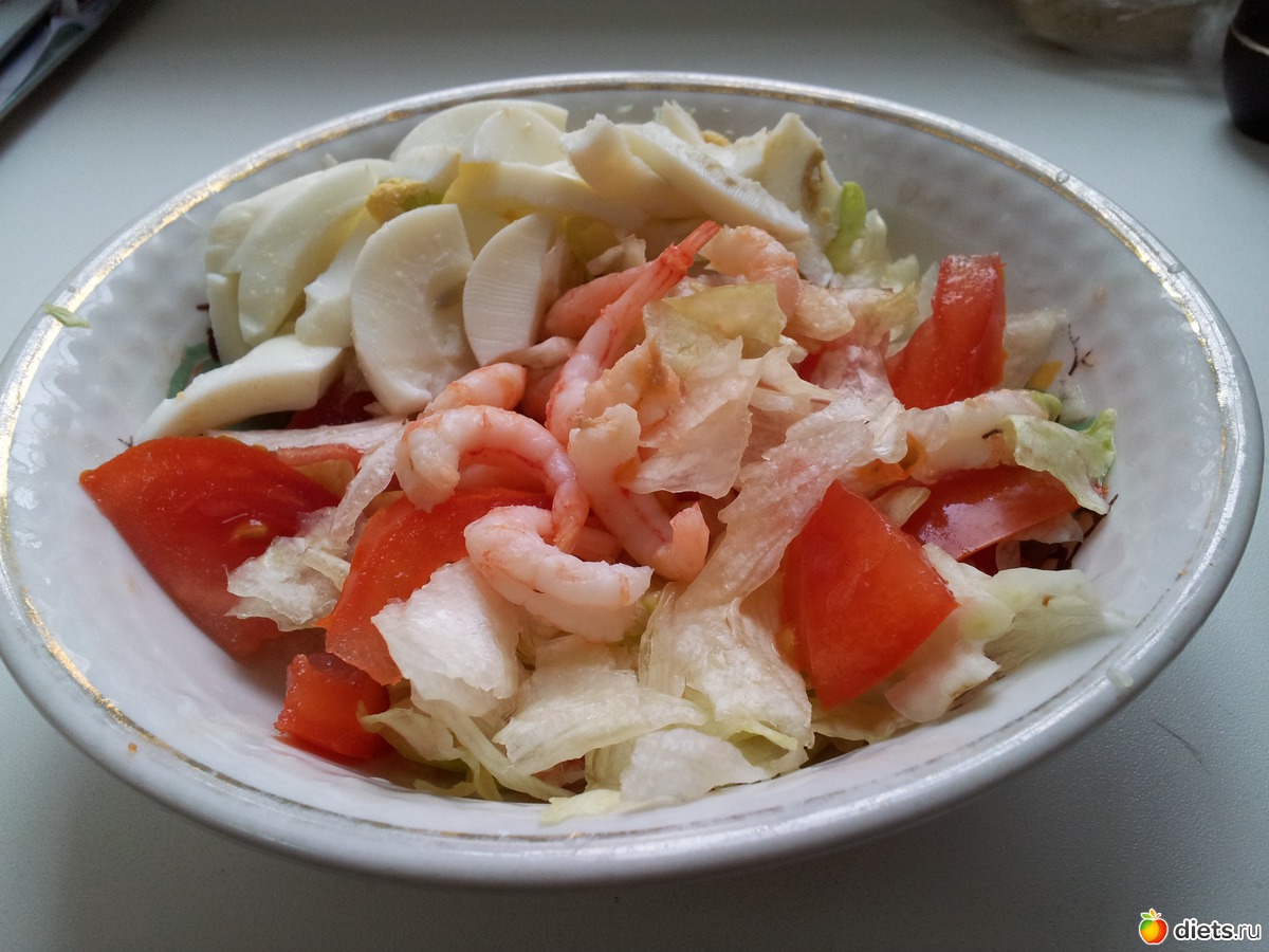 Белковый салат.Креветки,салат"Айсберг",белки и помидор!, альбом: Питание)