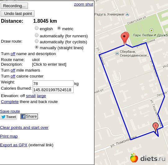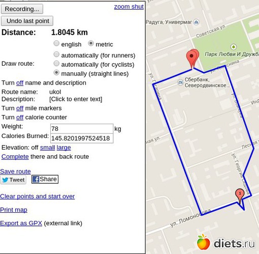 - Автоматически (для бегунов) выбор будет создать маршрут, который следует по улицам на карте. Линия будет автоматически идти вокруг углов и следуйте кривых в дороге.
