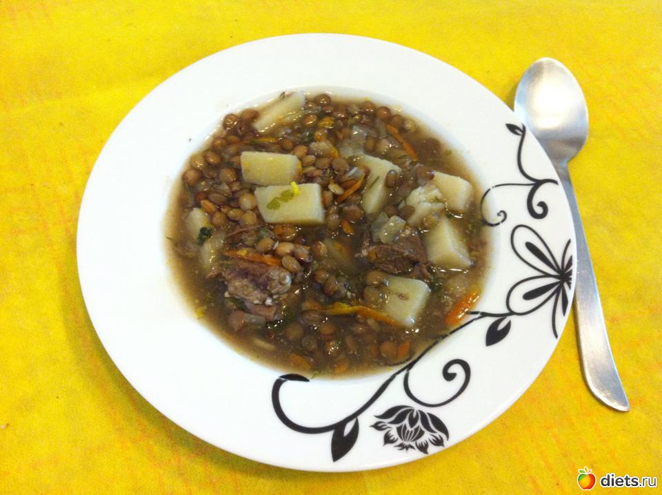 Отварила кусок говядины, как обычно - с лавровым листом и дущистым горошком.(Брала плечо). Отдельно отварила замоченную на несколько часов коричневую чечевицу. На сковородке зажарила луковицу, морковку и чеснок. В кипящий мясной бульон положила чечевицу и нарезанную картофелину, добавила поджарку и петрушку с укропом. Посолила,