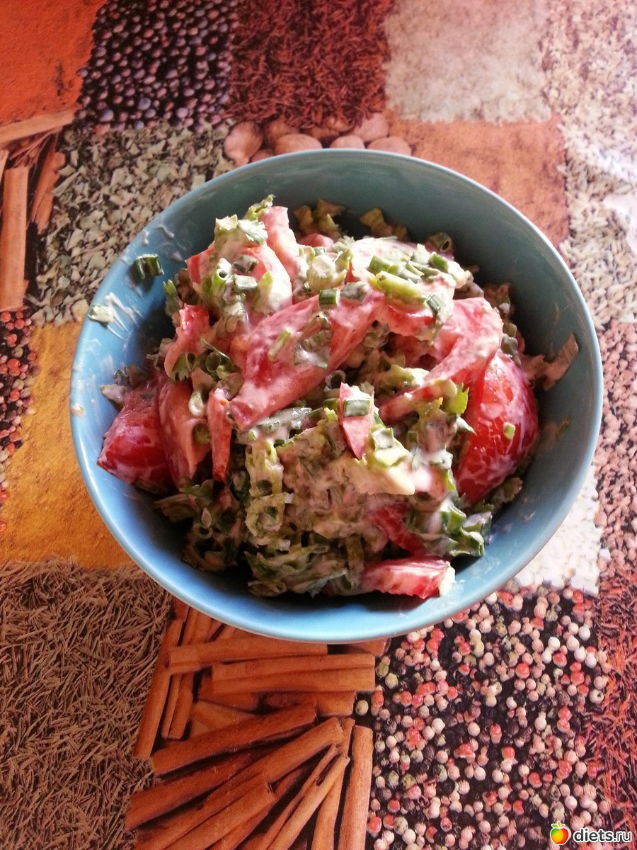 Итак, режем один большой помидор, кинзу, зеленый лук, добавляем листья салата, заправляем все мягким обезжиренным творогом или можно детским творожком без добавок, добавляем соль!