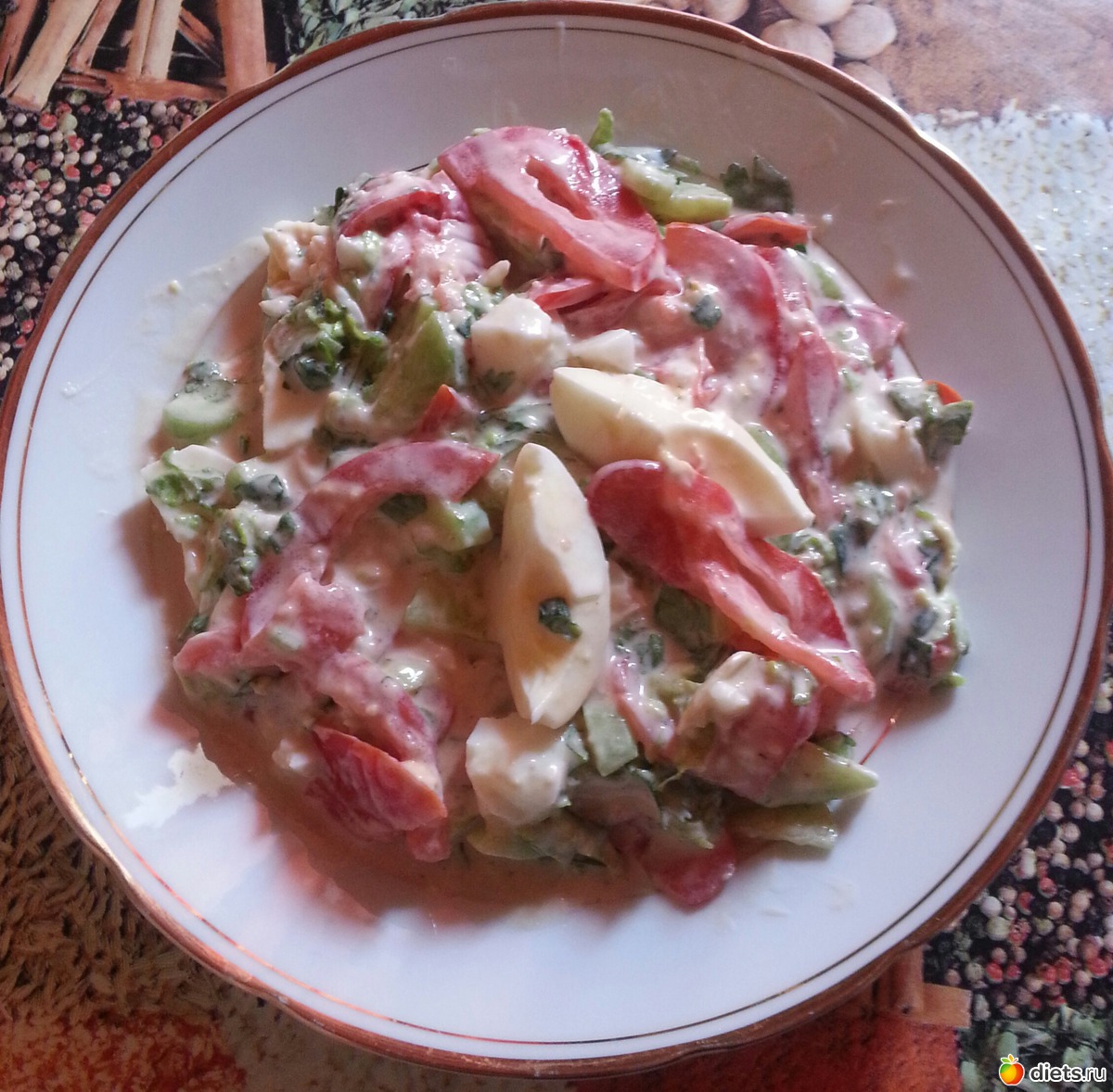 Берем 2 отварных яйца, один средний помидор, 2 зубчика чеснока, один огурец без кожуры, кинзу, базилик, зеленый лук, три листа пекинской капусты(только зеленую часть).Все режем, чеснок измельчаем, добавляем обезжиренный мягкий творог и соль!Готово!А главное очень быстро и сытно)
