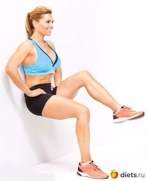 Прислонитесь спиной к стене и согните ноги в коленях: бедра параллельны полу, стопы вместе, ладони на бедрах. Удерживая спину и ягодицы прижатыми к стене, поднимите левое колено (см. фото). Вернитесь в исходное положение; поменяйте ноги. Повторите 12 раз.