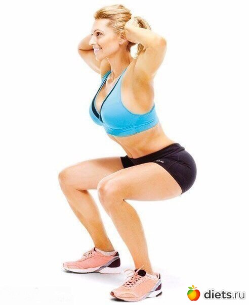 Представьте себе Отведите ягодицы назад, словно хотите сесть на стул. Бедра параллельны полу, колени строго над мысками.