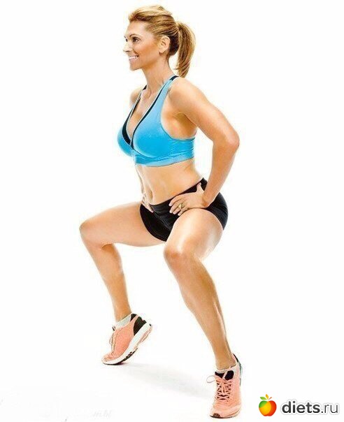 Расставьте стопы шире плеч, разверните носки наружу; поместите ладони на таз. Сгибайте ноги в коленях до тех пор, пока бедра не станут параллельны полу. Поднимите пятки (см. фото) и опустите их на пол. Повторите 12 раз.
