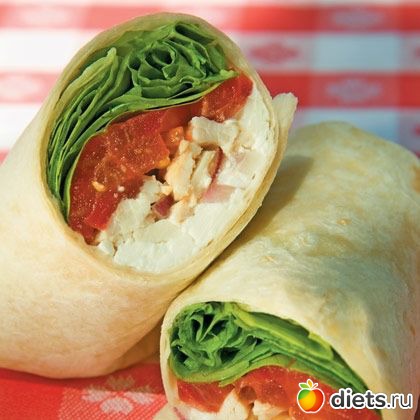 3. Лаваш подогрейте в микроволновке (примерно 10 секунд). В лаваш добавьте получившуюся заправку, сверху положите курицу, затем томаты, зеленый салат, снова заправку.