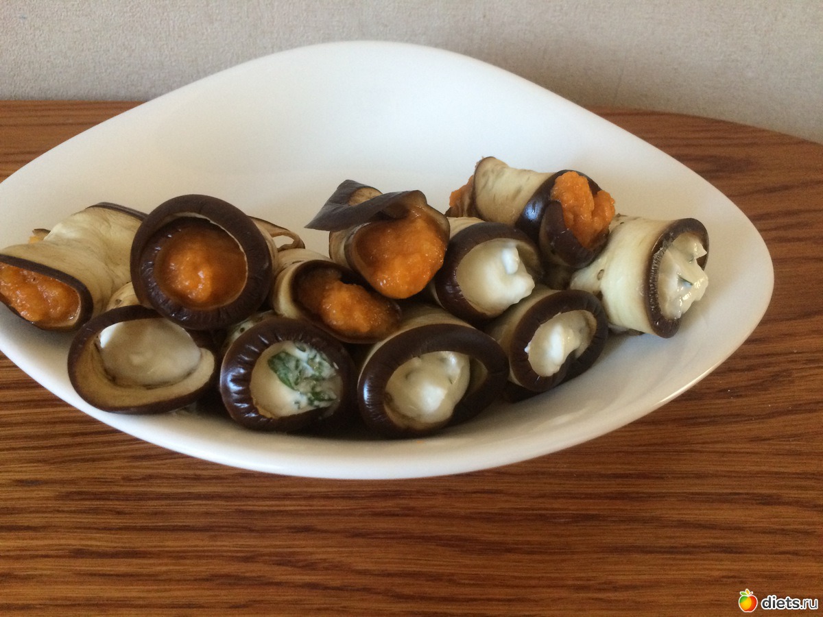 Баклажаны порезать вдоль га тонкие пластины, запечь вдуховке 10 минут. Для начинки брала творог мягкий с чесноком и зеленью; кабачковая икра домашняя.