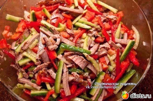 Нашинковать крупной соломкой помидоры, огурцы, красный перец, отварное мясо, лук. Добавить по вкусу соль, черный перец, сметану, хорошо перемешать. Сверху салат посыпать нарезанной зеленью.
