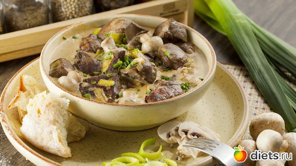 Как только печень будет готова, добавьте к ней обжаренные грибы, сметану, соль, перец и другие приправы по вкусу. Накройте сковороду крышкой и потушите все вместе еще 10 минут.