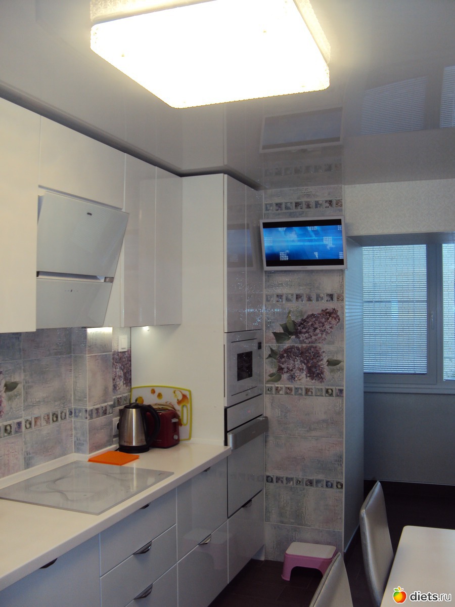А плитки сейчас так много красивой! И панно всяких много. Когда мы начинали, выбора не было большого. А я так люблю сиреневый цвет, что настояла на этой плитке с сиренью. Сын хотел что-то более строгое, черно-белое. И я рада, что вышло по-моему. Эта плитка делает кухню хоть и современной, но нежной, романтичной