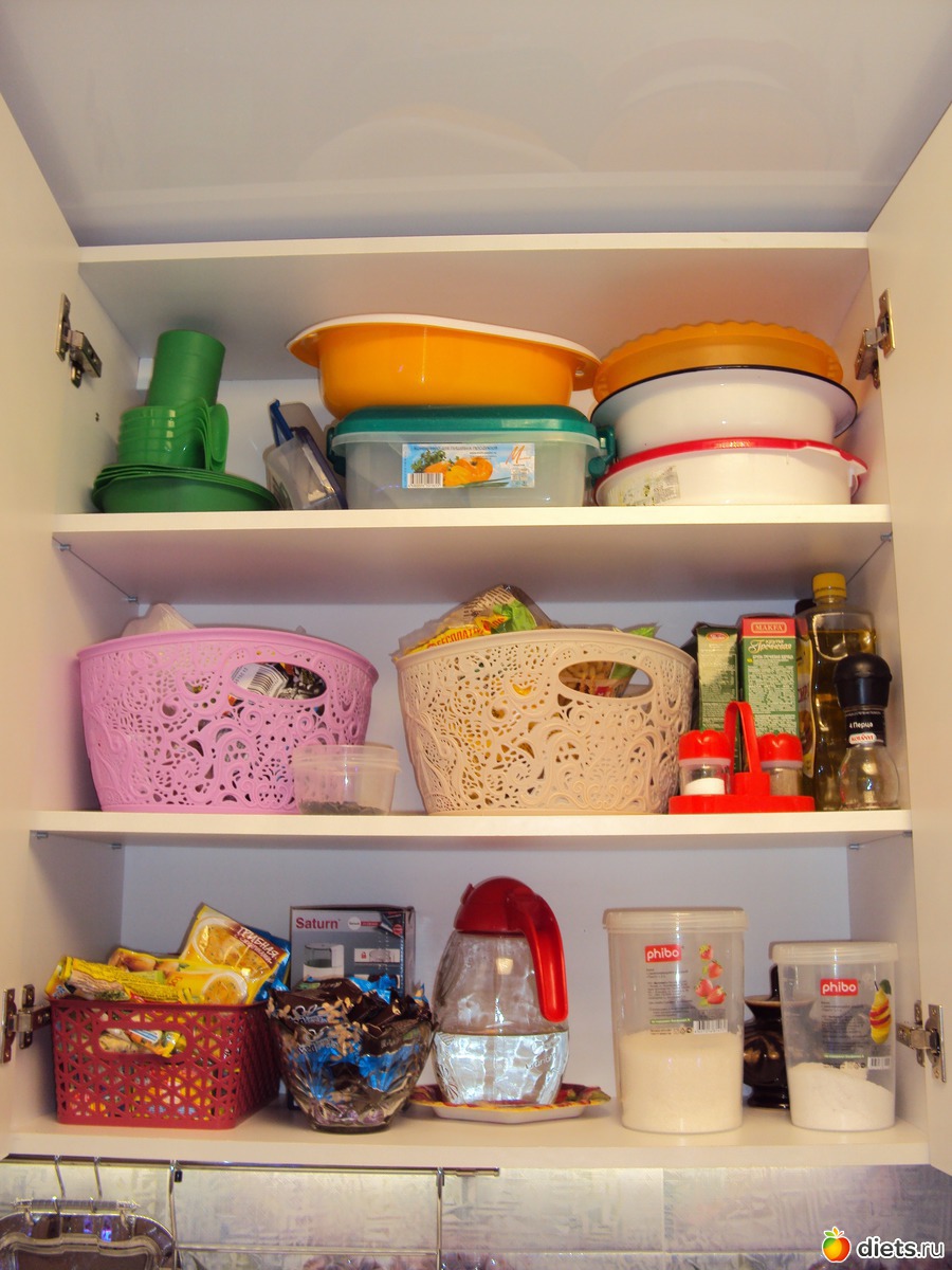 Верхний над рабочей зоной. В корзинках сложены вкусняшки к чаю и приправы. Вверху всякие тазики и посуда для выезда на природу.