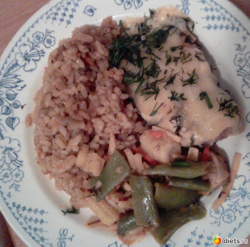 Запеченная курица с яблоками и луком, томленые овощи со сливками и чёрным первом, вермешель из твёрдых сортов пшеницы и острый красный перец