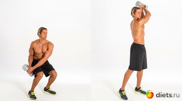 Техника: встаньте прямо, удерживая гантель в обеих руках над плечом. Присядьте, опустив гантель по косой линии поперек тела. Выполните обратное движение, чтобы вернуться в исходное положение. Сделайте предписанное количество повторений и перейдите на другую сторону.